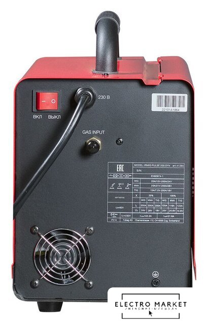 ручная дуговая сварка (MMA)/полуавтоматическая сварка (MIG MAG)/аргонодуговая сварка (TIG), 220 В, сварочный ток: 20–200 А, диаметр электрода: 1.5–4 мм, 9.96 кг