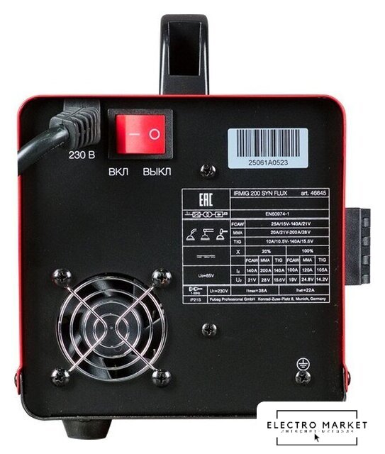 ручная дуговая сварка (MMA)/полуавтоматическая сварка (MIG MAG FCAW), входное напряжение 160–220 В, сварочный ток: 20–200 А, диаметр электрода: 1.6–4 мм, 7.8 кг