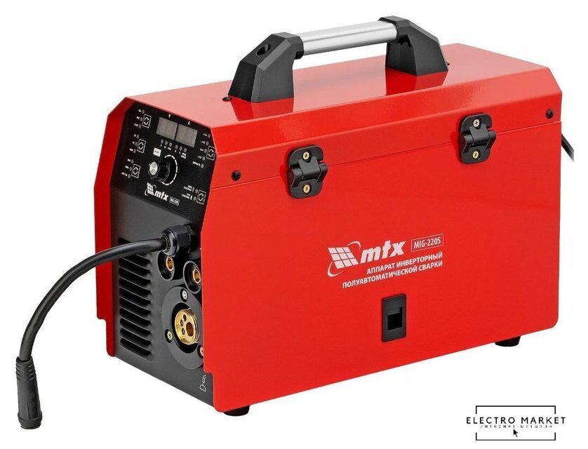 ручная дуговая сварка (MMA)/полуавтоматическая сварка (MIG MAG), 220 В, сварочный ток: 20–220 А, диаметр электрода: 1.6–4 мм, 12.5 кг