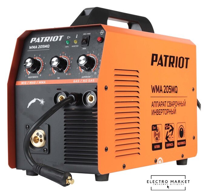 ручная дуговая сварка (MMA)/полуавтоматическая сварка (MIG MAG), 220 В, сварочный ток: 40–200 А, диаметр электрода: 0.6–4 мм, 12.4 кг