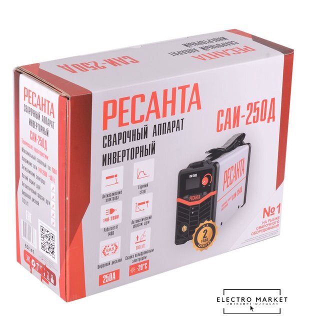 ручная дуговая сварка (MMA), входное напряжение 220 В, сварочный ток: 30-200 А, диаметр электрода: 1.6–5 мм, 4.64 кг