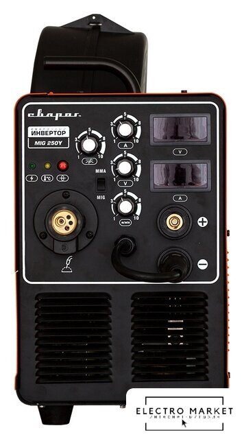 ручная дуговая сварка (MMA)/полуавтоматическая сварка (MIG MAG), 380 В, сварочный ток: 50–300 А, диаметр электрода: 0.8–1.2 мм, 25 кг