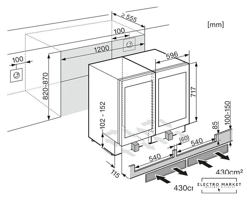 встраиваемый, 2 зоны температуры, 58 бутылок