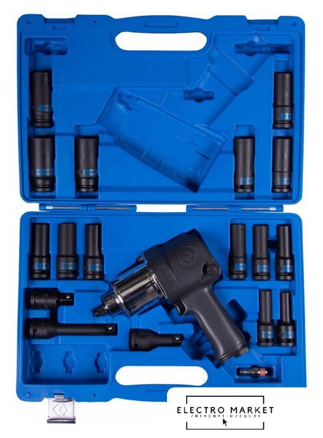 Комплектация | - Гайковёрт пневматический ударный (арт. 33411-050);- Головки ударные глубокие 8, 10, 12, 13, 14, 15, 16, 17, 18, 19, 21, 22, 24, 27 мм (серия 4435M);- Удлинитель ударный 125 мм (4260-05P);- Удлинитель ударный 75 мм (4260-03P);- Кардан ударный шаровый 60 мм (4799P);- Штуцер БРС (SY-211M);- Инструкция по эксплуатации; -Кейс из пластика PE-HD. |