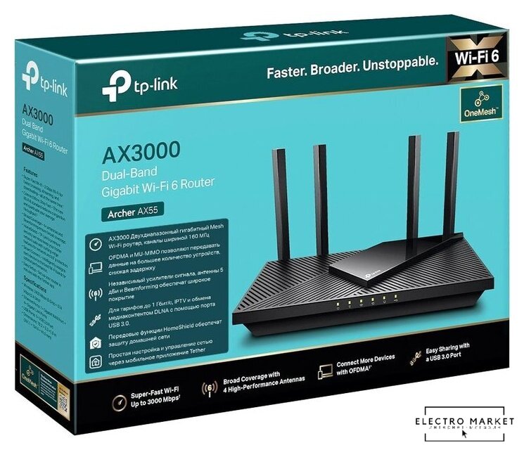 802.11ax (Wi-Fi 6), 2.4 ГГц/5 ГГц, до 3000 Mbps, 802.1X, WAN, 5xGigabit LAN, 1xUSB