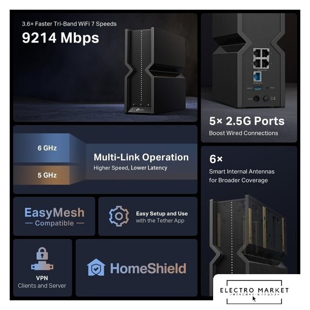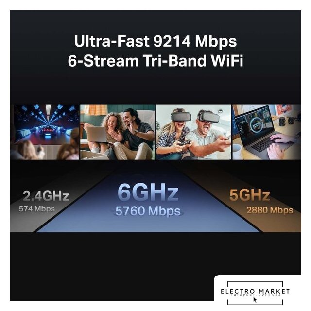 802.11ax (Wi-Fi 6), 2.4 ГГц/5 ГГц, до 6000 Mbps, WAN, 4xGigabit LAN, 2x2.5 Gigabit LAN, 1xUSB