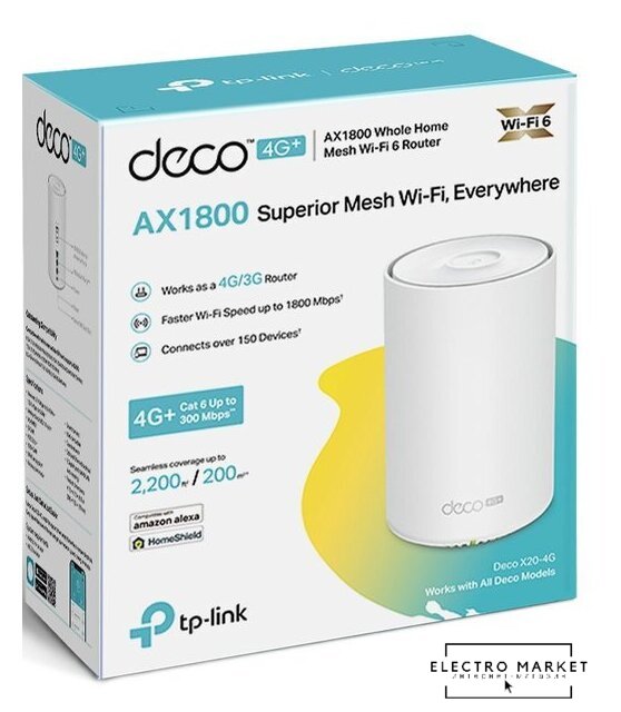 | Комплектация | Deco X20-4GКабель Ethernet RJ45Адаптер питанияРуководство по быстрой настройкеАдаптер SMB/SMA (2 шт.) |