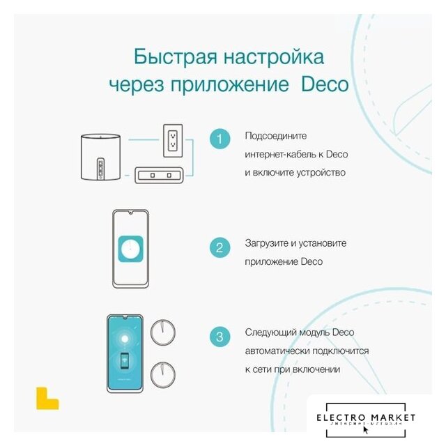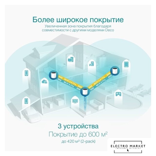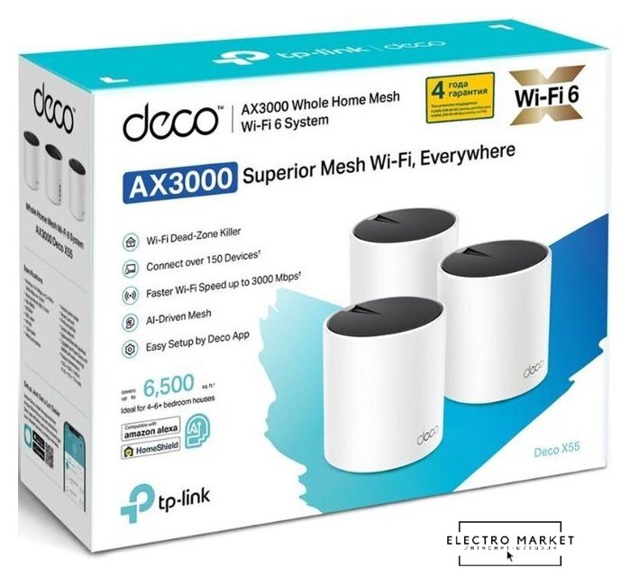 | Комплектация | Deco X55 (3 шт.)Кабель Ethernet RJ45Адаптер питания (3 шт.)Краткое руководство по настройке |