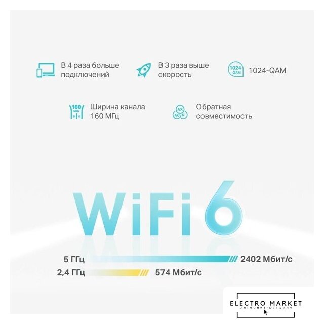 802.11ax (Wi-Fi 6), 2.4 ГГц/5 ГГц, до 6600 Mbps, WAN, 4xGigabit LAN, 1x2.5 Gigabit LAN, 1xUSB