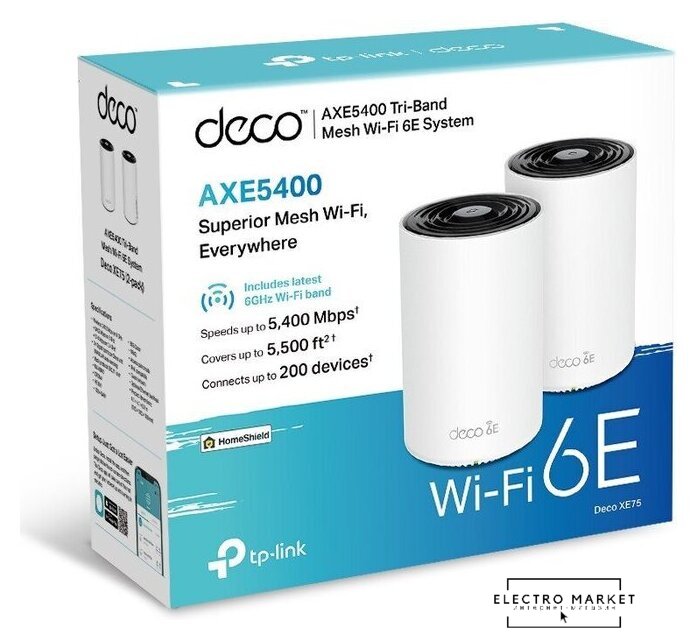 | Комплектация | - Deco XE75 (2 шт.)- Блоки питания (2 шт.)- Кабель Ethernet (2 шт.)- Документация |