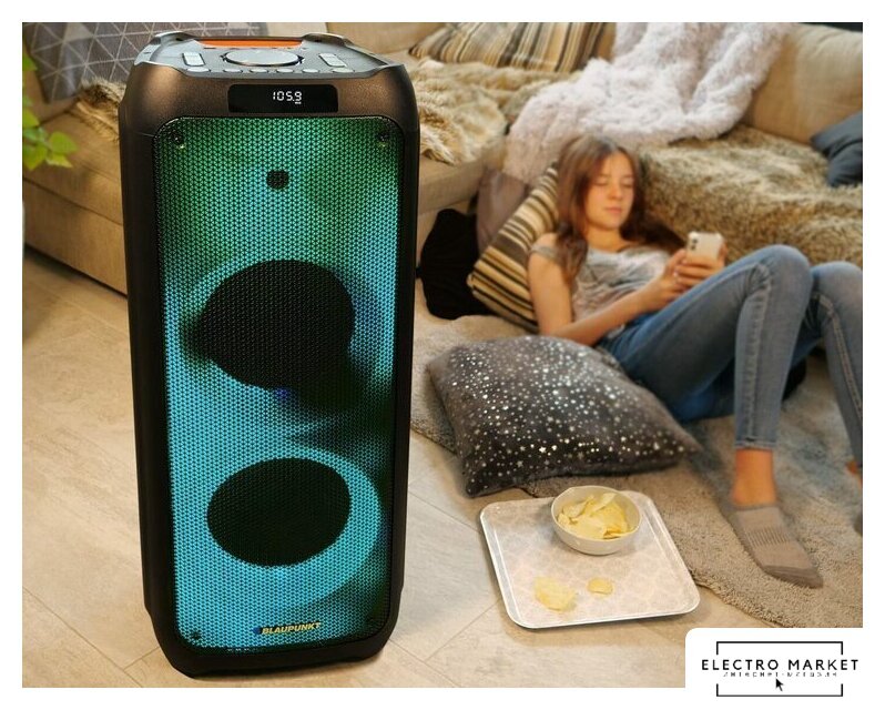 номинальная мощность 480 Вт, воспроизведение с USB, питание от сети и аккумулятора, BT 5.3, AUX, влагозащита IPX4, время работы: 8 ч.