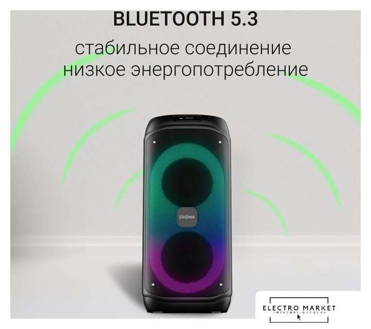 номинальная мощность 60 Вт, воспроизведение с USB/microSD, питание от сети и аккумулятора, BT 5.0, AUX, время работы: 5.5 ч.