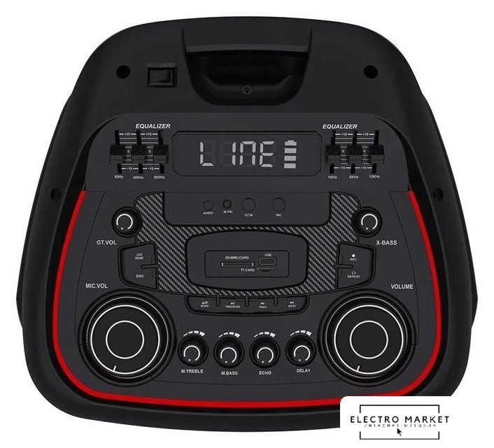 номинальная мощность 200 Вт, воспроизведение с USB/microSD/SD, питание от сети и аккумулятора, BT, AUX, время работы: 5 ч.