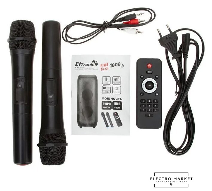 | Комплектация | - пульт ДУ- два беспроводных микрофона- аудиокабель 3.5 мм - 2RCA- кабель питания- документация |
