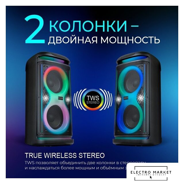 номинальная мощность 120 Вт, воспроизведение с USB, питание от аккумулятора, BT 5.3, AUX, влагозащита IPX4, время работы: 18 ч.