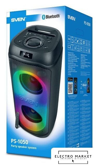 номинальная мощность 150 Вт, воспроизведение с USB/microSD, питание от сети и аккумулятора, BT 5.3, AUX, время работы: 10 ч.